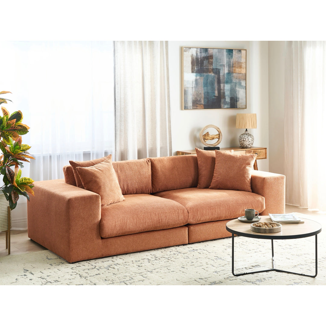 Three-quarters view of an orange sofa with cushions on a white background