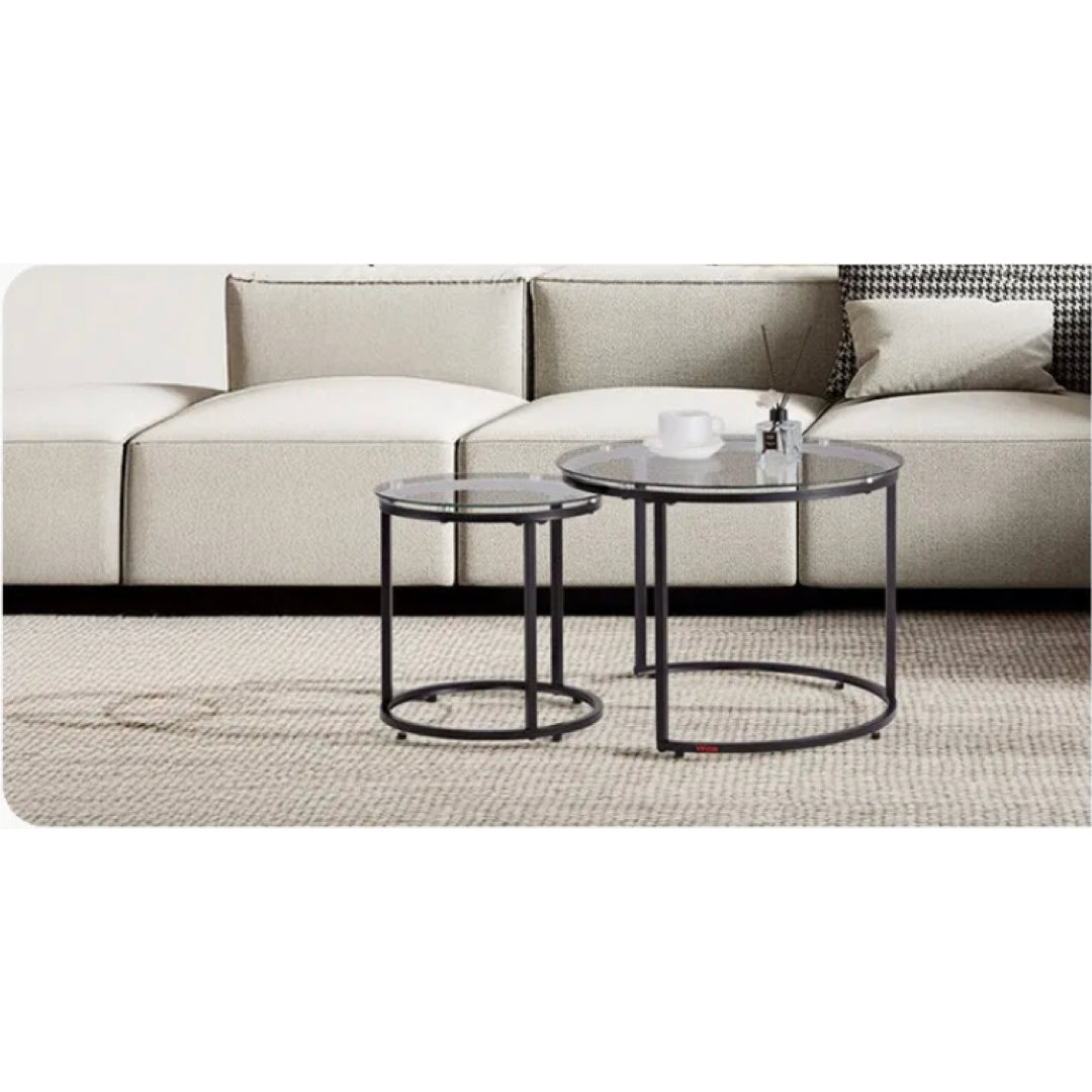 This glass nesting table set is flexible and ideal for various settings, offering extra desktop space. The sturdy steel legs ensure stability and support. Use them side by side or separately as needed, with easy assembly. It combines practicality and style.
